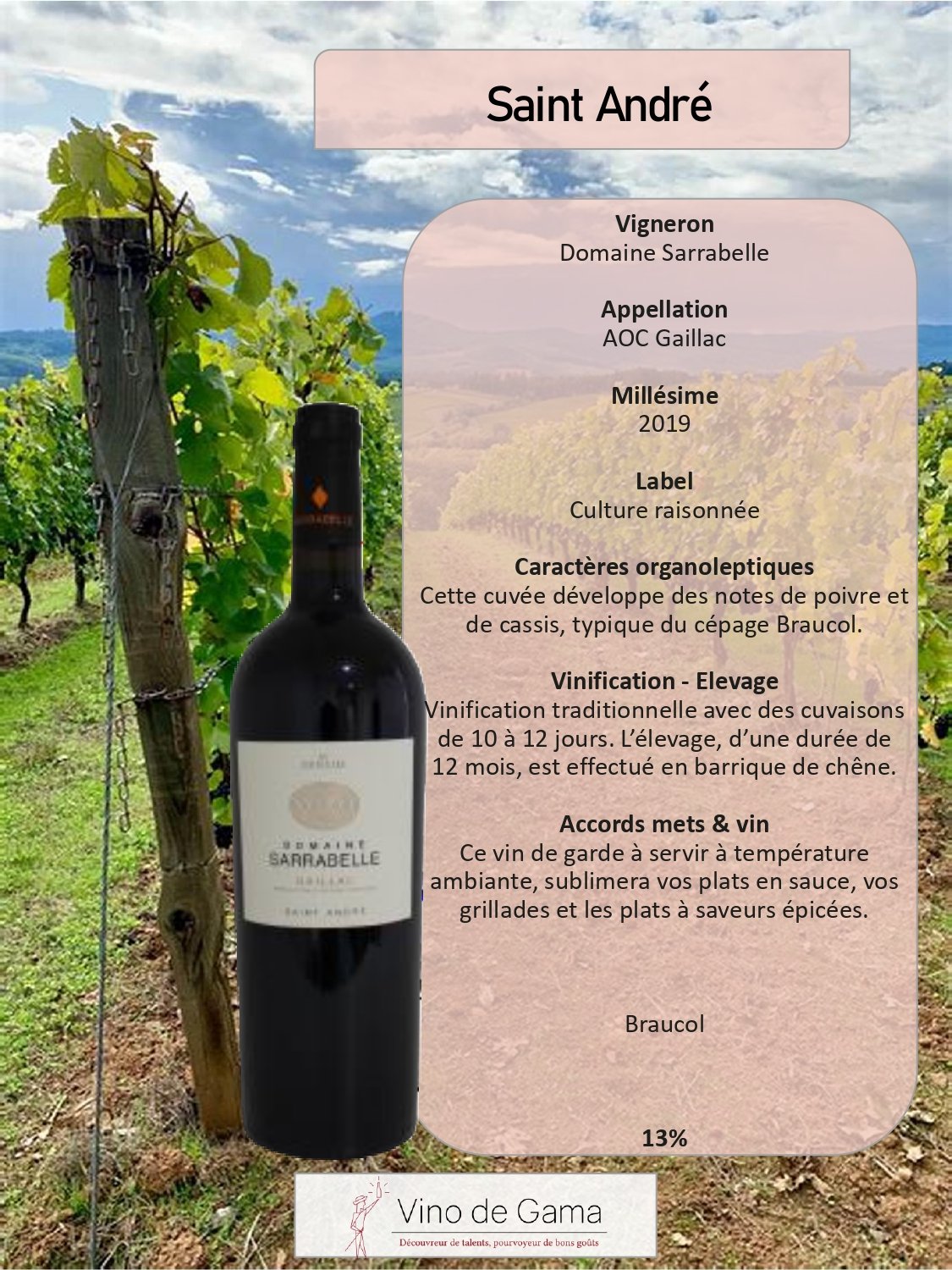 Issu du cépage typique du Sud-Ouest, Braucol, ce vin rouge du Domaine Sarrabelle offre une belle expression du terroir de Gaillac. Au nez, il révèle des notes intenses de poivre et de cassis, caractéristiques du cépage, avec une personnalité affirmée.